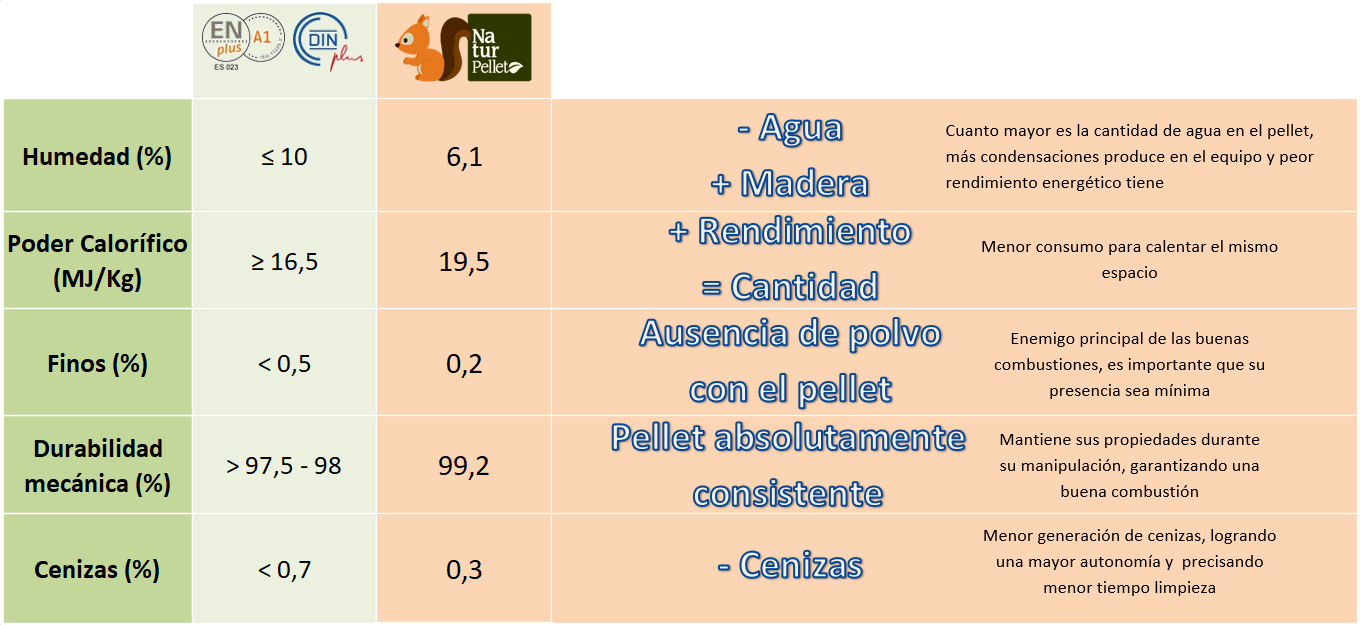 Partiendo de la alta calidad de la materia prima utilizada, la asepsia procurada durante su manipulación y el proceso tecnológico instalado, que permite el control automático continuo de todas y cada una de las variables, se consigue un pellet cuyas características cumplen ampliamente los estándares fijados por la norma EN-PLUS-A1. La formación se lleva a cabo con la única aplicación de calor, comprimiendo las micropartículas mediante rodillos y forzando su paso por las matrices granuladoras, en ausencia total de cualquier aditivo químico o colas aglutinantes. Energía limpia y 100 % natural.